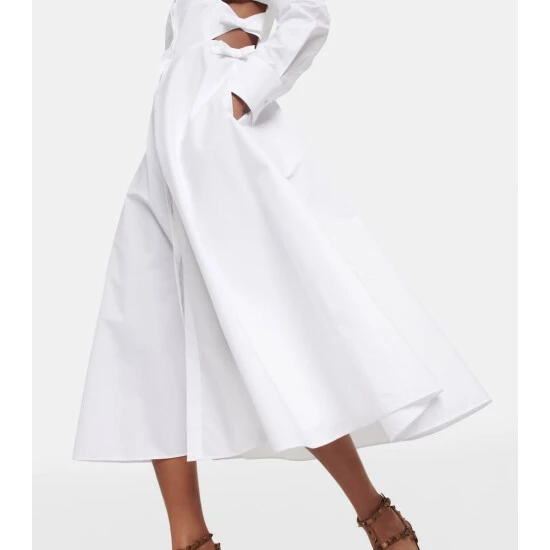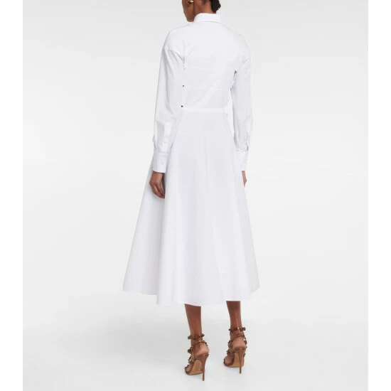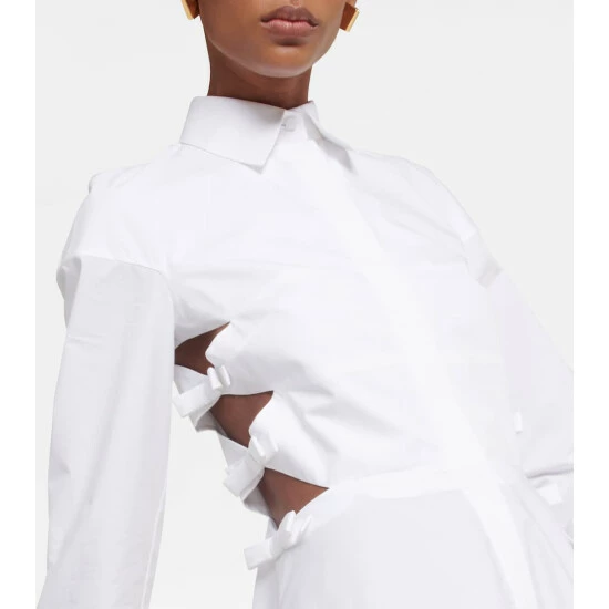 Valentino reimagines traditional tailoring codes with fresh reverence for this cotton shirt dress. Shaped with a point collar, fitted waist, and flared skirt, this style is characterized by bow-embellished cutout sides.
