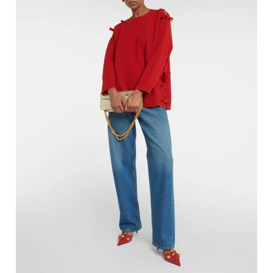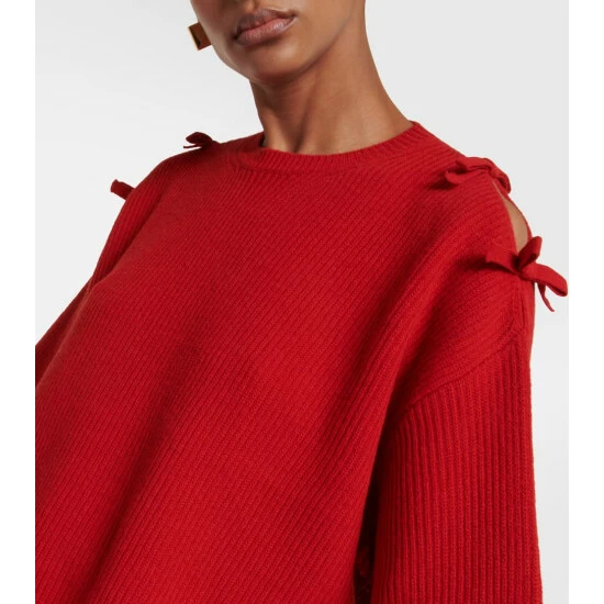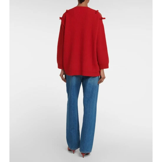 Valentino imbues the classic essence of knitwear with its vibrant vision. This virgin wool sweater has ladylike bows to the shoulders and the longline ribbed-knit hem, offsetting a timeless round-neck silhouette.