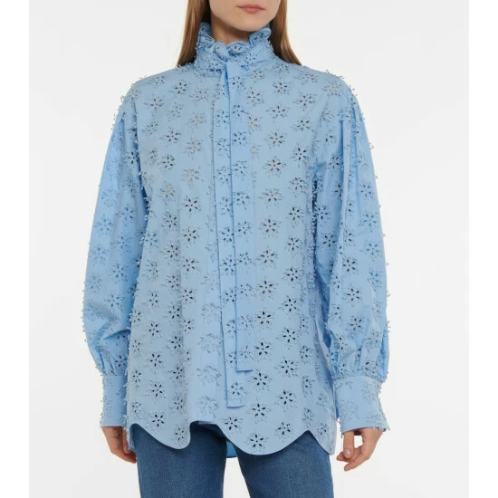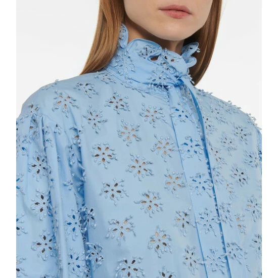 This blouse evidences Valentino’s dedication to craftsmanship and fine detail, from the frilled self-tie neck to the scalloped hem. The cotton-blend design features broderie anglaise florals throughout.