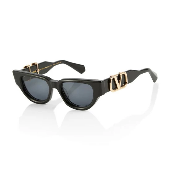 These Valentino sunglasses have a contemporary cat-eye silhouette. They’re made from acetate with black frames and dark gray lenses.