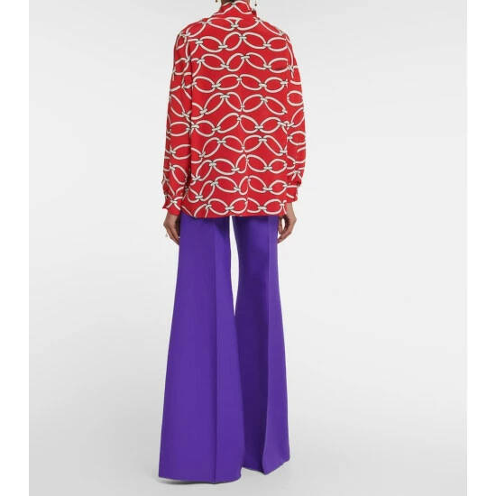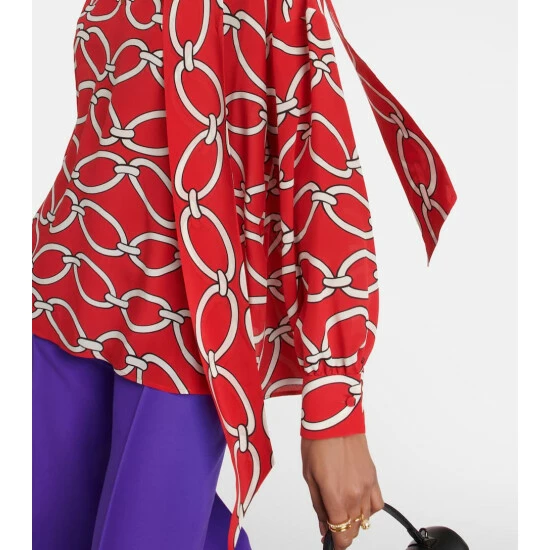 Valentino’s archival Chain 1967 print defines this elegant blouse, offering label-signature style. Made in Italy from lustrous silk, the flowing design features cursive logo detailing, a buttoned front, and a scarf detail at the neck.
