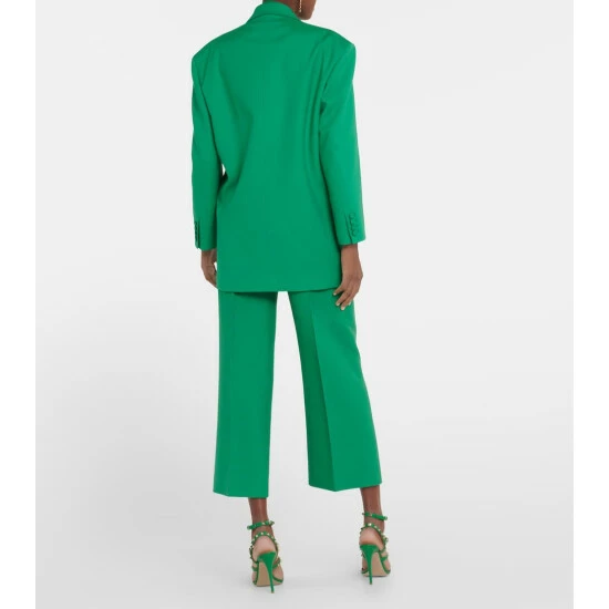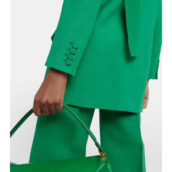 Valentino’s signature Crêpe Couture fabric – a luxurious wool and silk blend – provides structure and a beautiful drape. This double-breasted blazer is lined with silk and has a boxy profile with bold shoulders and straight sleeves.
