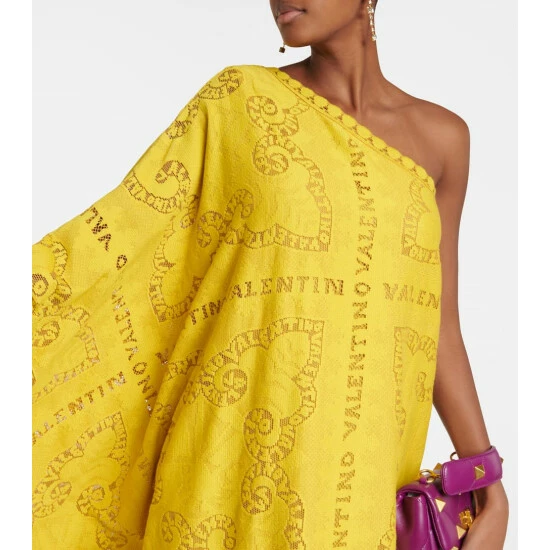Synonymous with Valentino’s vivacious vision, this gown imbues signature house codes. Made from a cotton blend, this one-shoulder style has intricate cutwork with logo lettering, bordered by scalloped trims.