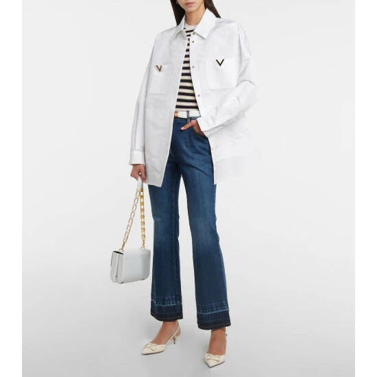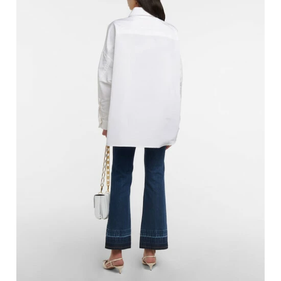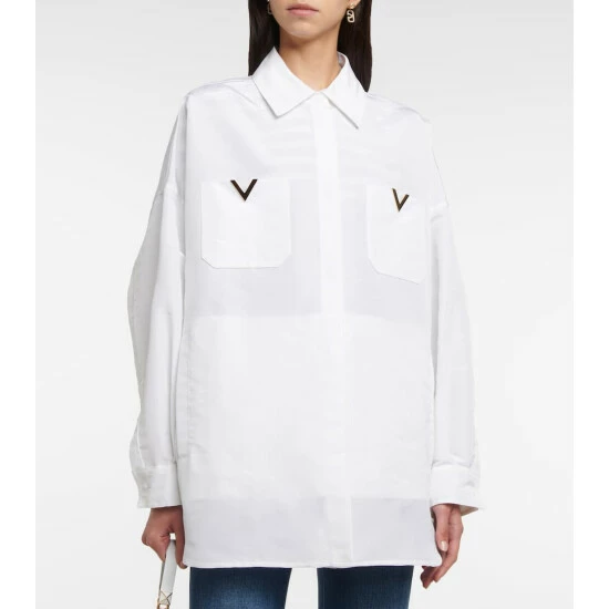 Made in Italy from white silk, this oversized Valentino shirt features dropped shoulders, a pointed collar, and gleaming V-shaped hardware adorning the breast pockets.