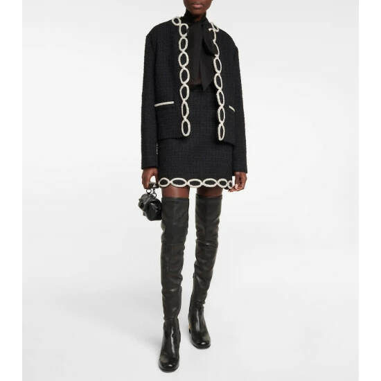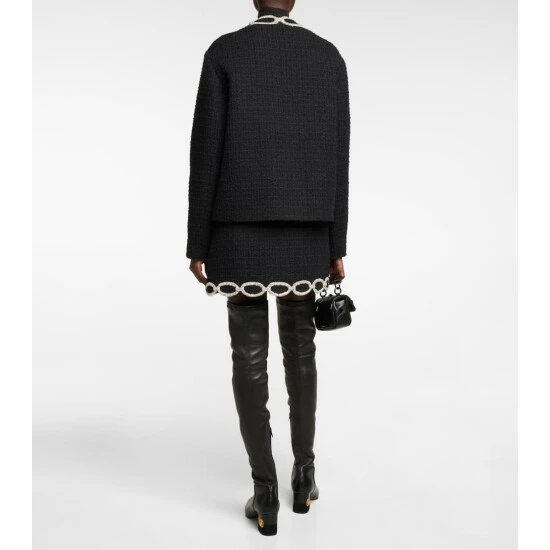 Valentino adds some character to the timeless tweed jacket for this embellished style. Characterized by micro bead embroidery that forms a Valentino Chain motif to the collarless front, this style has a classic, boxy silhouette.