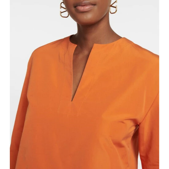 Gossamer feathers adorn the cuffs of this minidress from Valentino, finishing it on a statement note. It’s cut from structured cotton-blend micro faille with a tunic-inspired neckline.