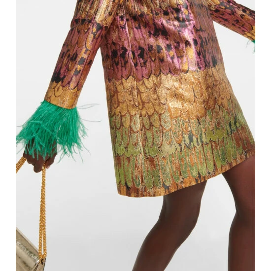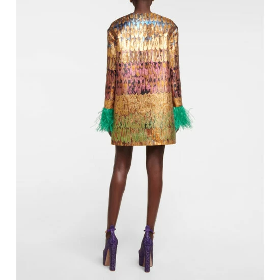 Infused with nostalgic references to the shining era of disco, this minidress appears with scintillating depth. A lustrous jacquard style, this kaftan-inspired silhouette features a notched neckline and dramatic feather cuffs.