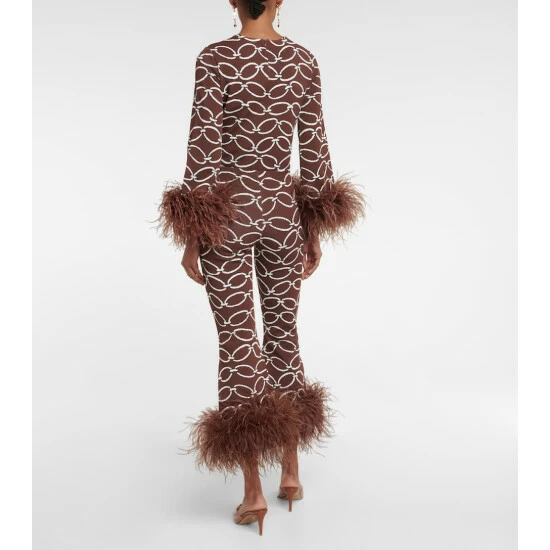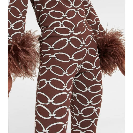 Valentino’s cinematic essence is spotlighted by these dynamic pants. Appearing with tonal plums of feathers to the form-fitting legs, this style has a chain-link print and a cropped length.