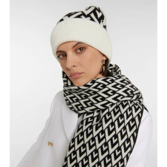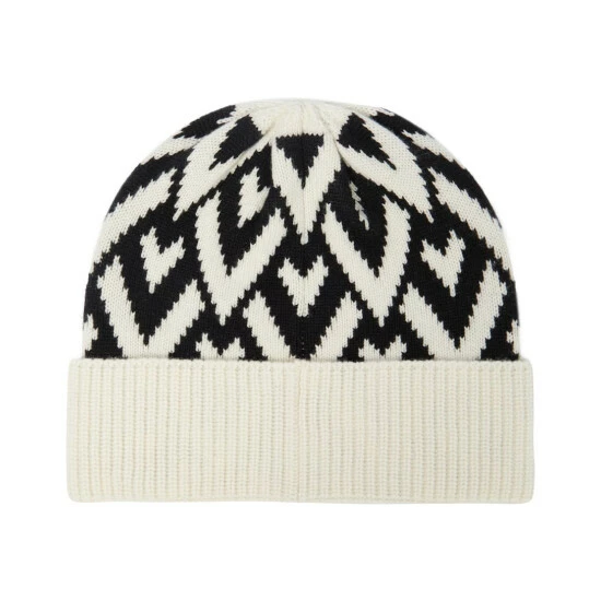 This beanie from Valentino is knitted from pure cashmere and features a ribbed brim and a black and white intarsia design.