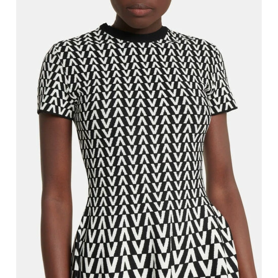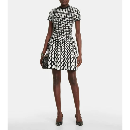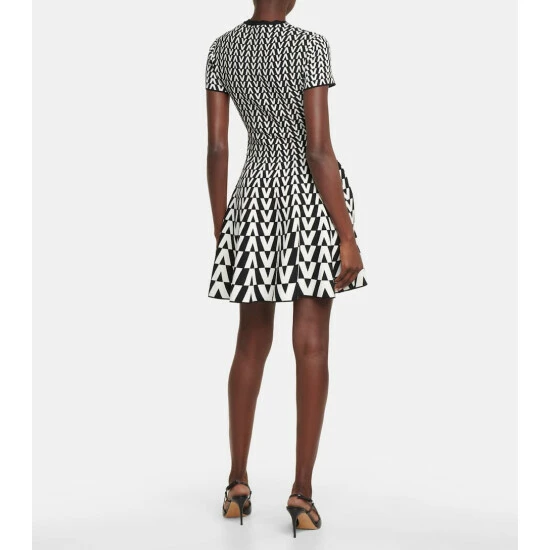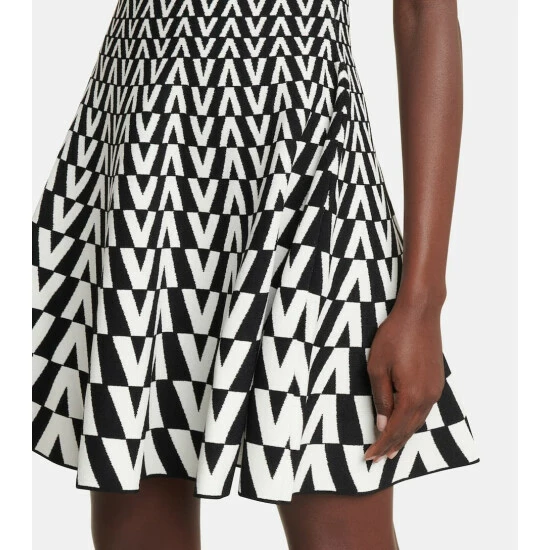 This Valentino dress is made from compact jacquard knit and patterned with a monochrome V motif. Unlined, it has a fit-and-flare silhouette with a pleated skirt that shows a seasonal penchant for short hemlines.