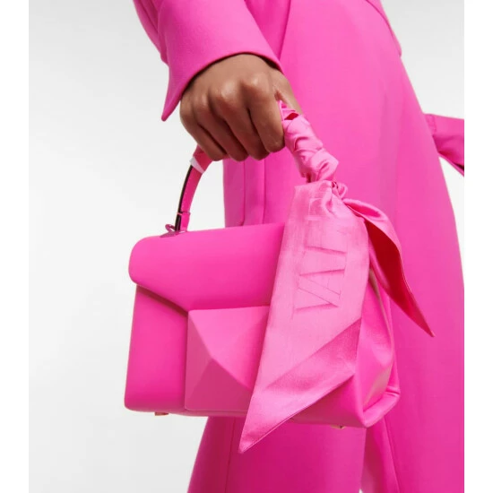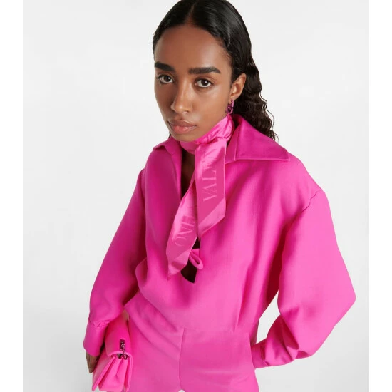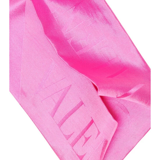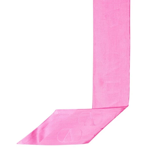Valentino’s logo decorates this slim pink silk scarf, which you can use to brighten your outfit or your bag handle.
