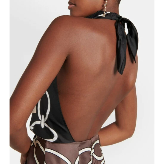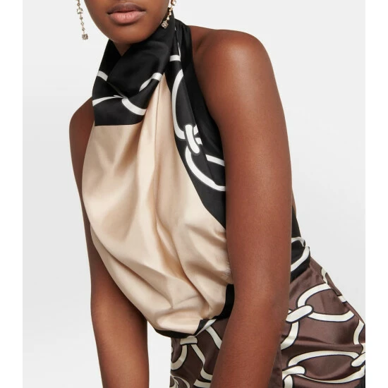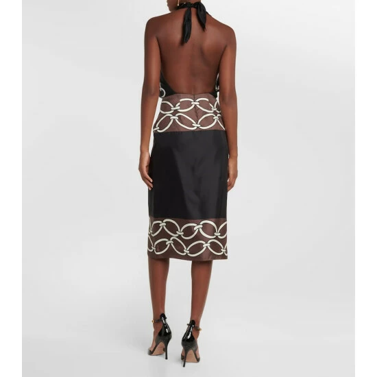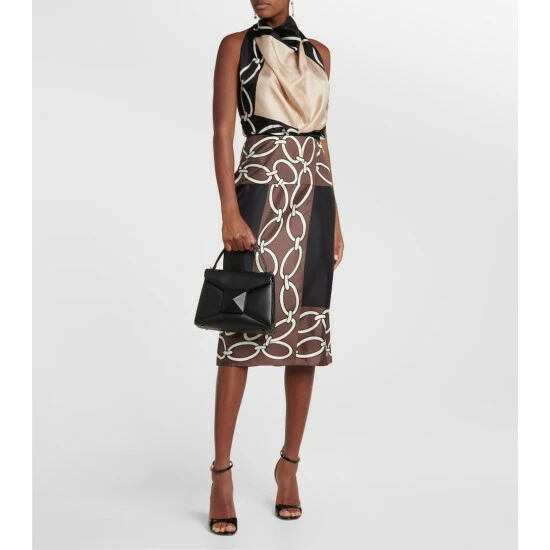 Valentino takes inspiration from silk scarves with this eye-catching midi dress. Crafted from pure silk, the style is defined by a draped halter-neck top that extends to a wrap skirt, both featuring a chain-link motif.
