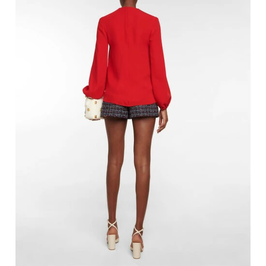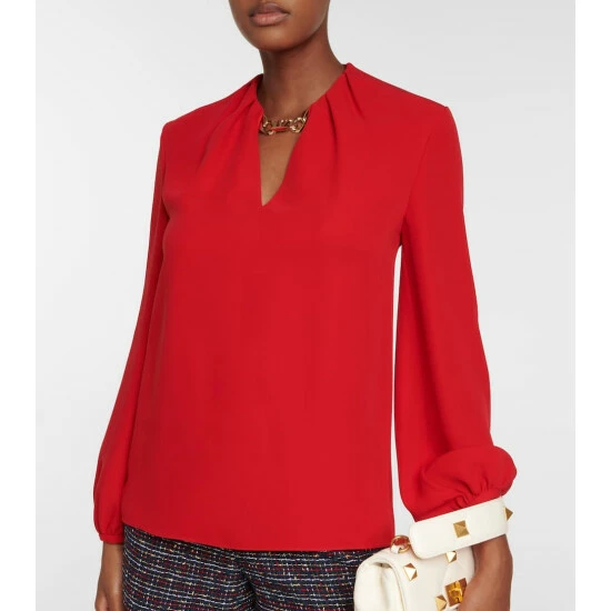 Add color to your workwear edit with this elegant silk cady blouse from Valentino. It has a billowing, loose fit with voluminous sleeves and a V-neckline that’s accented with a golden hardware.