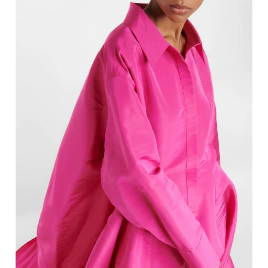 This bold gown from Valentino ensures you’ll make a grand entrance. Made from silk faille in the brand’s ultra-saturated Pink PP shade, it has a shirt collar and a flared silhouette that’s emphasized by a fitted waist.