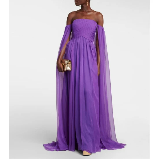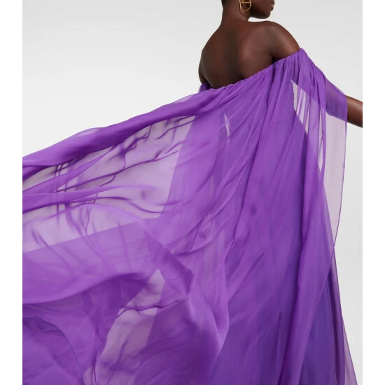 Valentino’s cascading gown celebrates modern femininity. Made in Italy from lustrous silk, this dramatic piece has an off-shoulder neckline with arm cuffs that create an elegant cape, a pleated bodice, and a flowing skirt.
