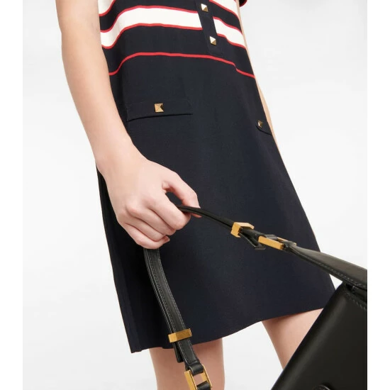 This knit minidress from Valentino features a striped motif and gold-tone VLogo embroidery. Accented with pyramidical studs, it has a V-neckline, a shirt collar, and two patch pockets.