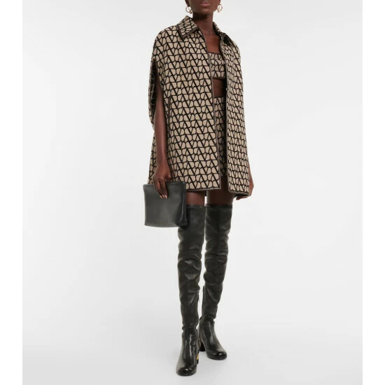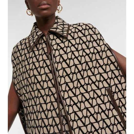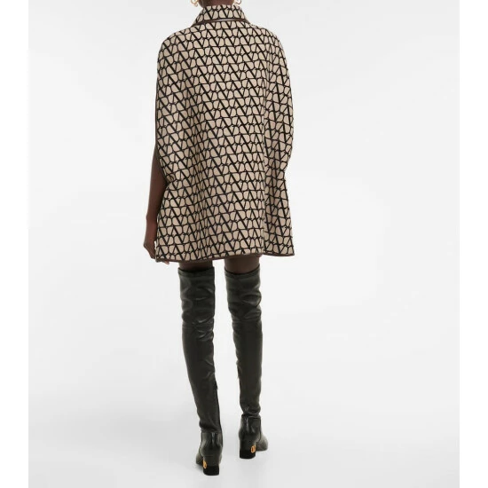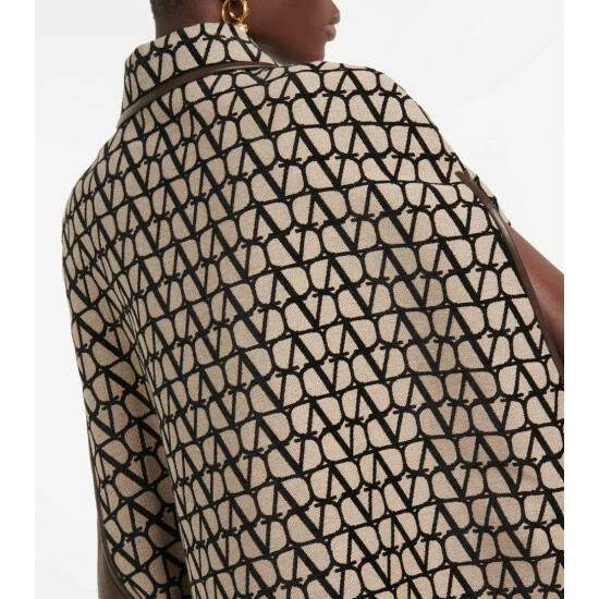 Valentino’s Toile Iconographe collection introduces a ’70s-inspired repeating VLogo pattern that has a striking visual impact. Made from a cotton-blended structured fabric, this cape features a sharp collar, hook fastenings, and polished leather trims.