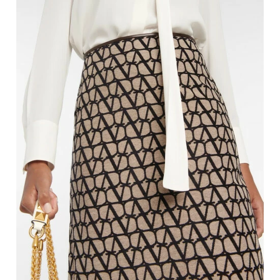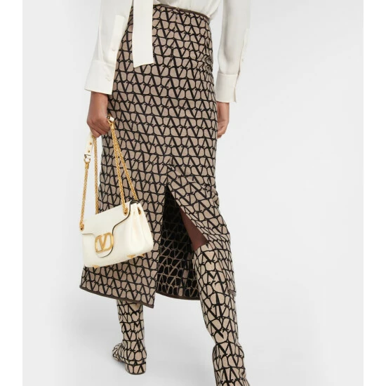 Valentino’s Toile Iconographe collection introduces a ’70s-inspired repeating VLogo pattern that has a striking visual impact. This skirt is made from canvas with a midi length and leather trims.
