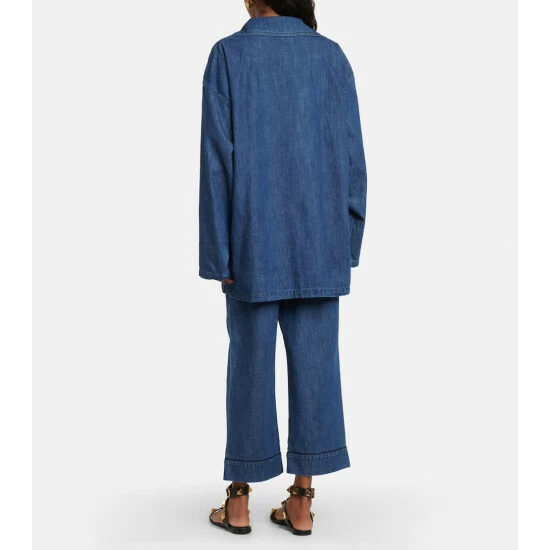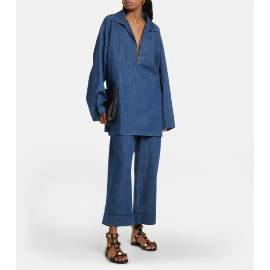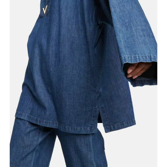 This minidress from Valentino is made from cotton chambray with a denim look. Accented with the VGOLD detail, it has a kaftan neckline.