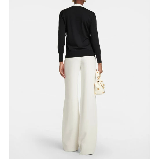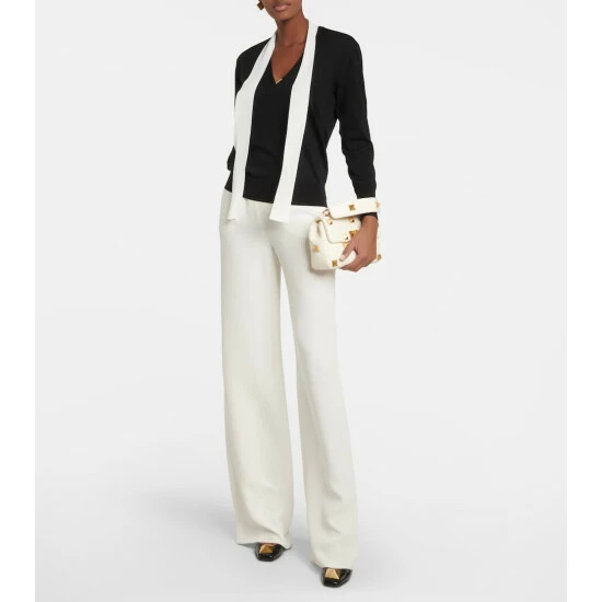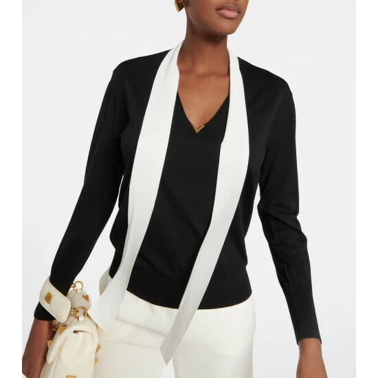 This sweater from Valentino is knitted from virgin wool. It has a V-neckline with contrasting selt-tie details and VGOLD hardware.