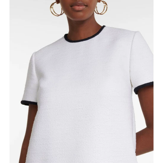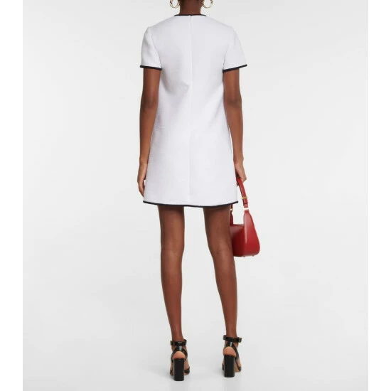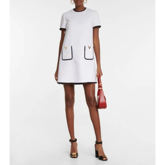 This minidress is made from crisp, sturdy tweed with navy blue piping and a full lining. It comes in a shift silhouette and features patch pockets with VGOLD hardware.