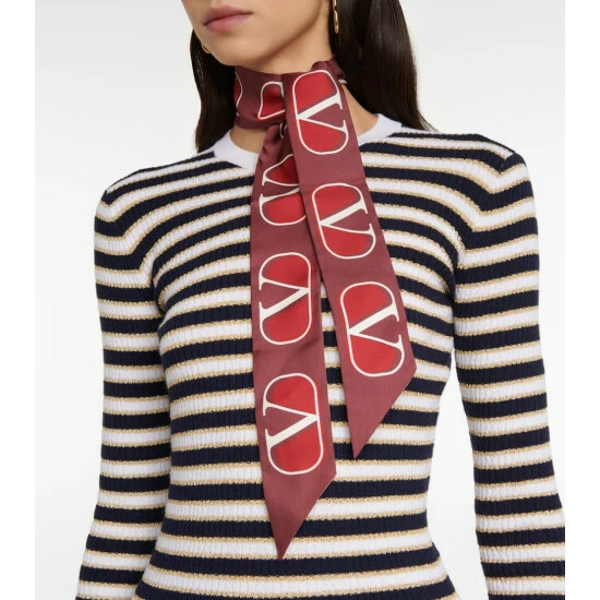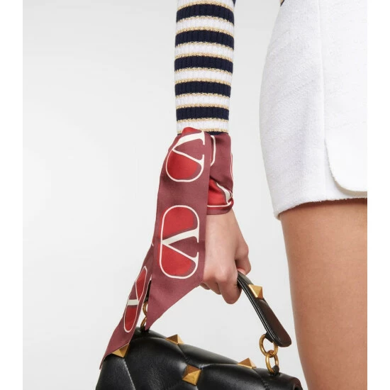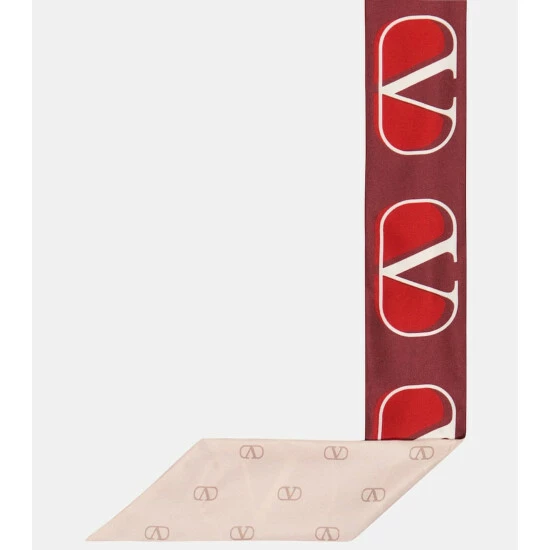 Valentino’s VLogo is printed all over this slim red silk scarf, which you can use to brighten your outfit or your bag handle.