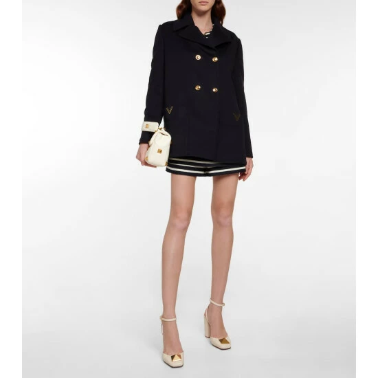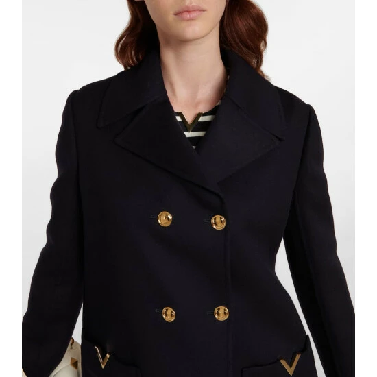 Stay warm in style with this wool and cashmere pea coat from Valentino. It has a classic cut with a double-breasted front that’s punctuated with golden buttons and “V” hardware.