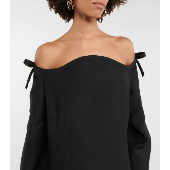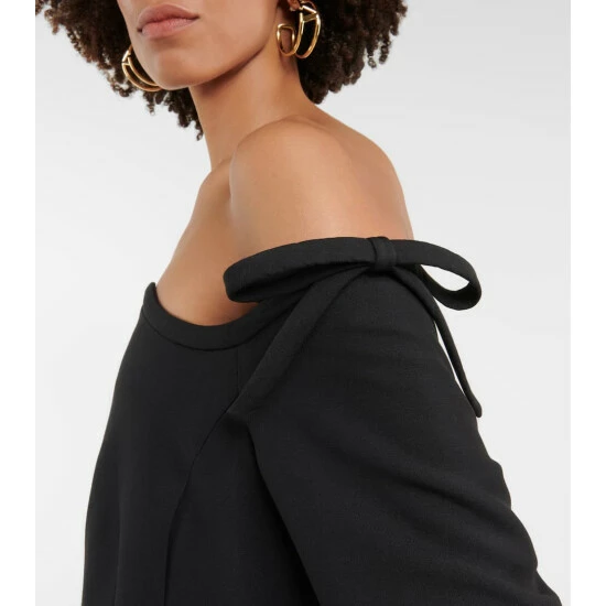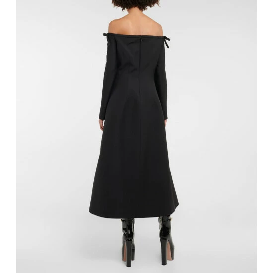 Sophisticated details underpin this black midi dress from Valentino. Elegant in its simplicity, this wool and silk crêpe couture off-shoulder design has a waved neckline punctuated with shoulder bows, slim sleeves, and a capacious skirt.