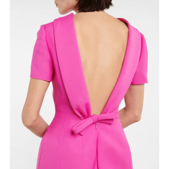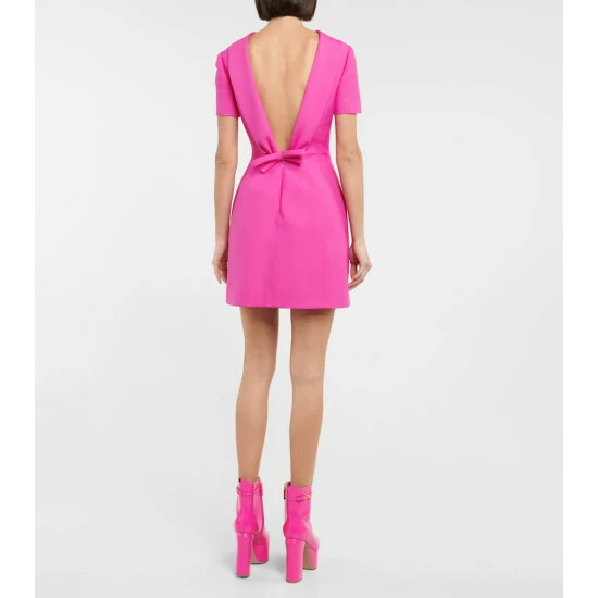 Valentino’s Pink PP hue is the brand’s newest signifier. Elegant in its simplicity, this wool and silk crêpe couture minidress has a short-sleeved tulip shape silhouette, an open back, and a bow tie accent.