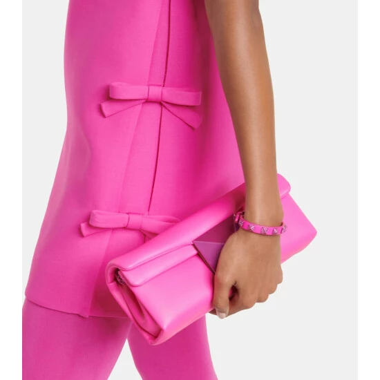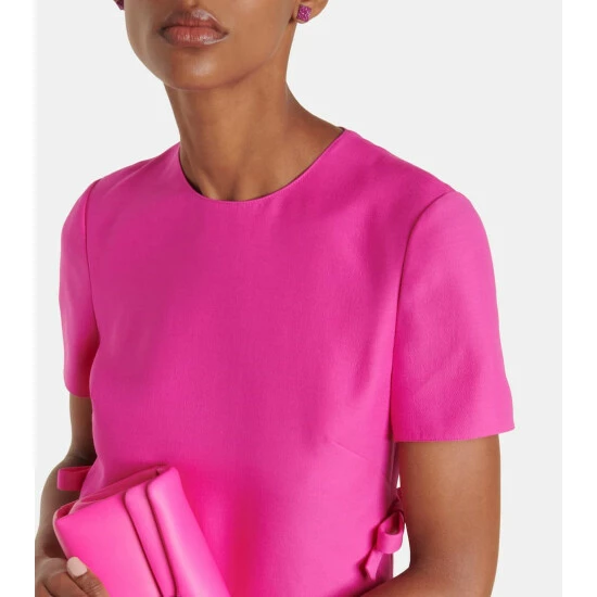 Valentino’s Pink PP hue is the brand’s newest signifier. Elegant in its simplicity, this wool and silk crêpe couture minidress has a ’60s-inspired shift silhouette and bow-trimmed side seams.