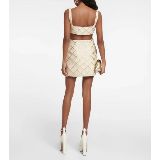 This wool-blend brocade miniskirt from Valentino is elaborately crafted with golden threads in a checked pattern. Style it with the matching jacket.